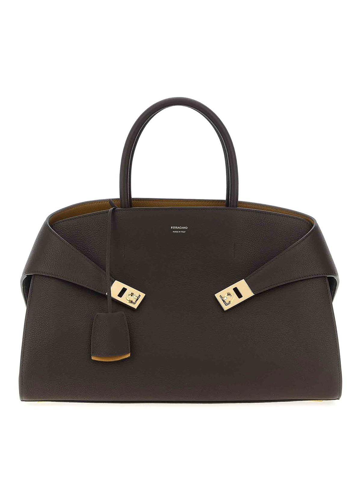 sac à main martelé Hug M'avec logo gaufré, soufflets latéraux avec décoration en boucle Gancini, breloque amère, double porte-clés amovible