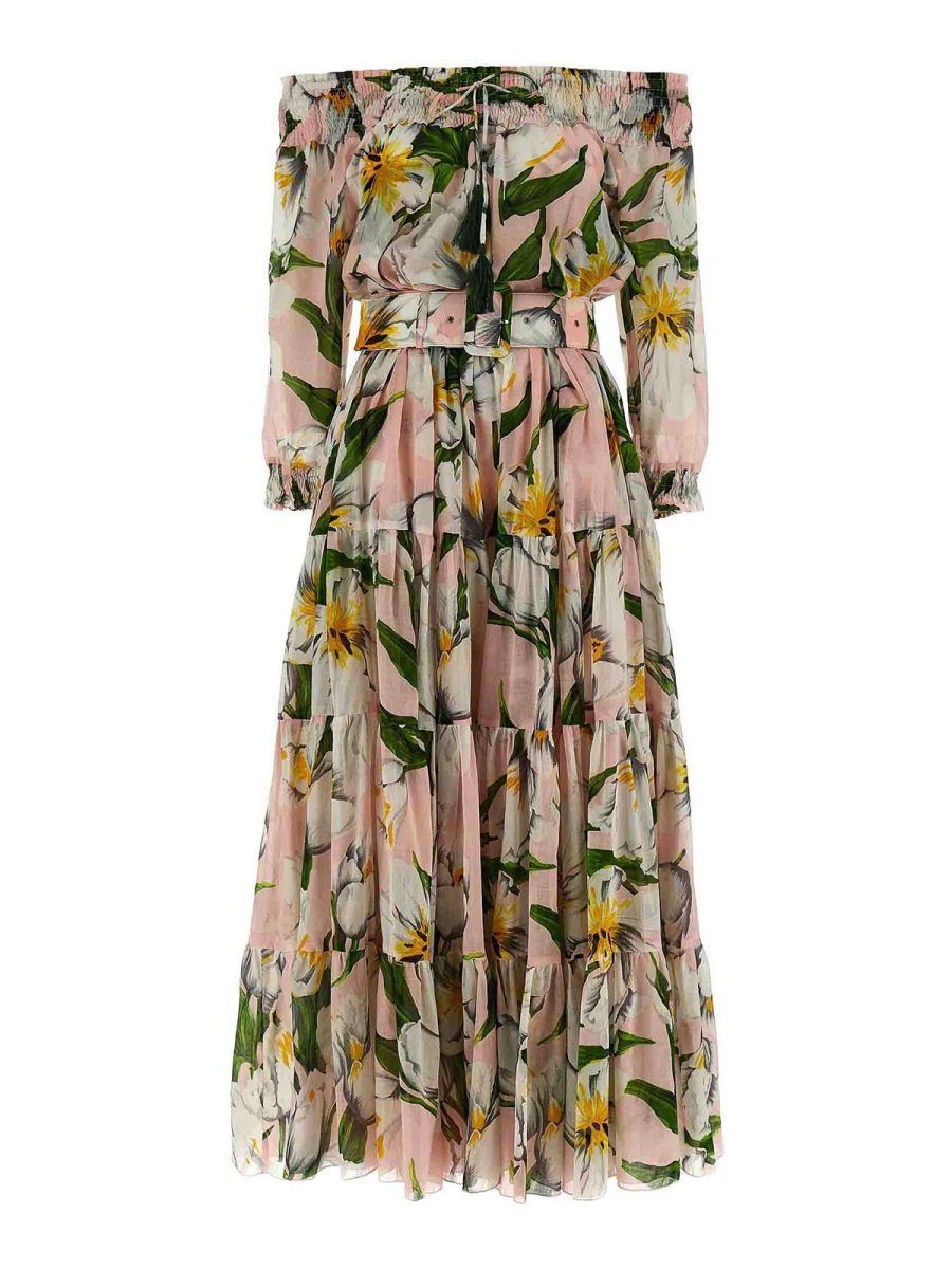 Robe longue « Eden » entièrement, en mousseline désimprimée, style épaules avec point smock et cordon de serrage, jupe large, jupe/manches avec point smock sur le bas, ceinture et ceinture assorties amovibles