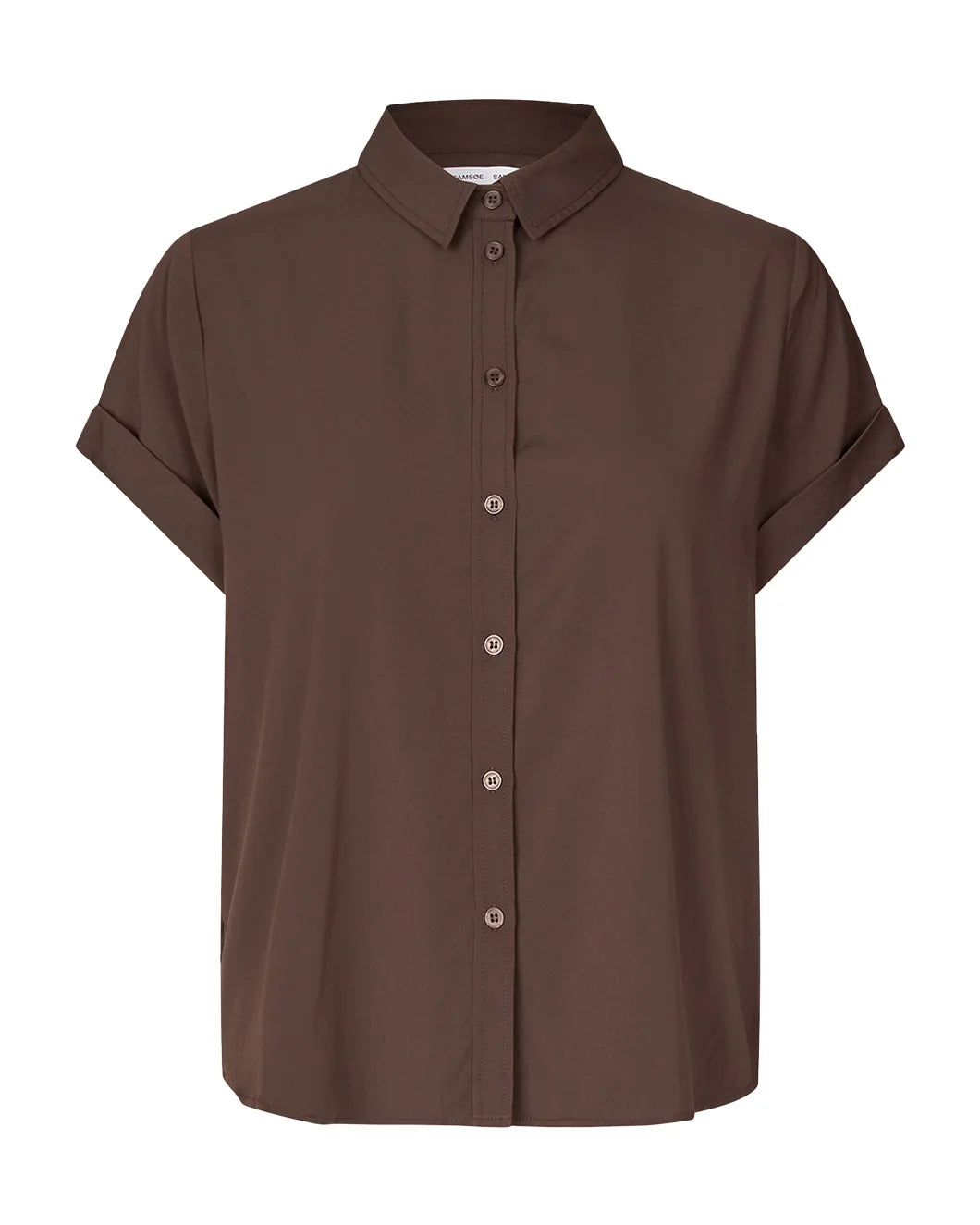 The Majan Shirt in Viscose in the color Black Coffee by Samsoe Samsoe is a short-sleeve button up that features a collared neckline, back center pleats and rolled hem sleeves. This product contains LENZING™ ECOVERO™ Viscose, certified with the EU Ecolabel for meeting high environmental standards. Material: 96% Viscose LENZING™ ECOVERO™, 4% Elastane Details: Regular Fit. The center back length is 64 cm on a size S. Fit: The model is wearing a size S. Style it with: Denim and a cardigan for a layer fall look. Care: Hand Wash #F19123672