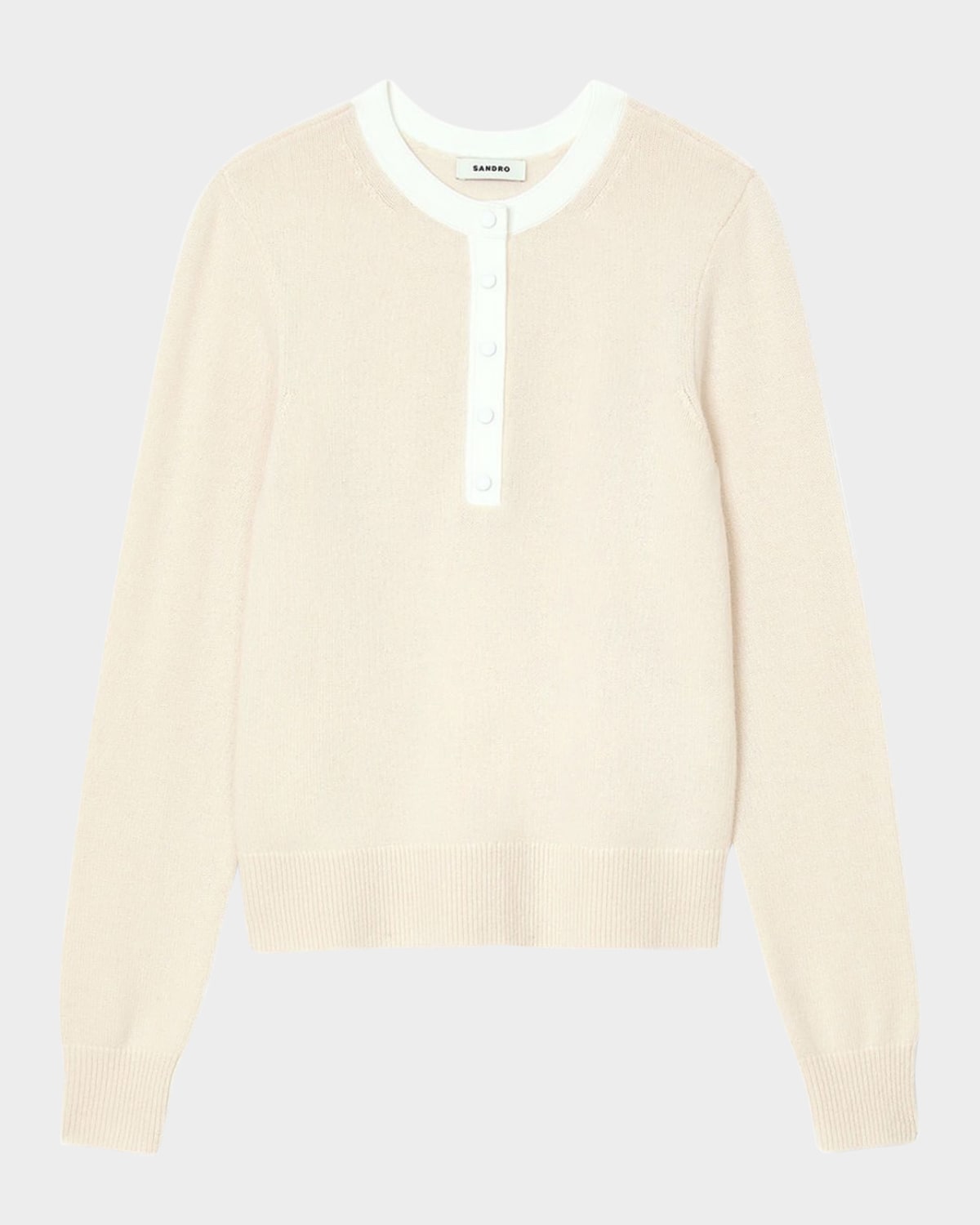Sandro "Edouard" sweater with a contrasting placket Crew neckline; partial pressstud front Long sleeves Hip length Classic fit Ribbed cuffs and hem Pullover style Wool/cashmere Hand wash Imported