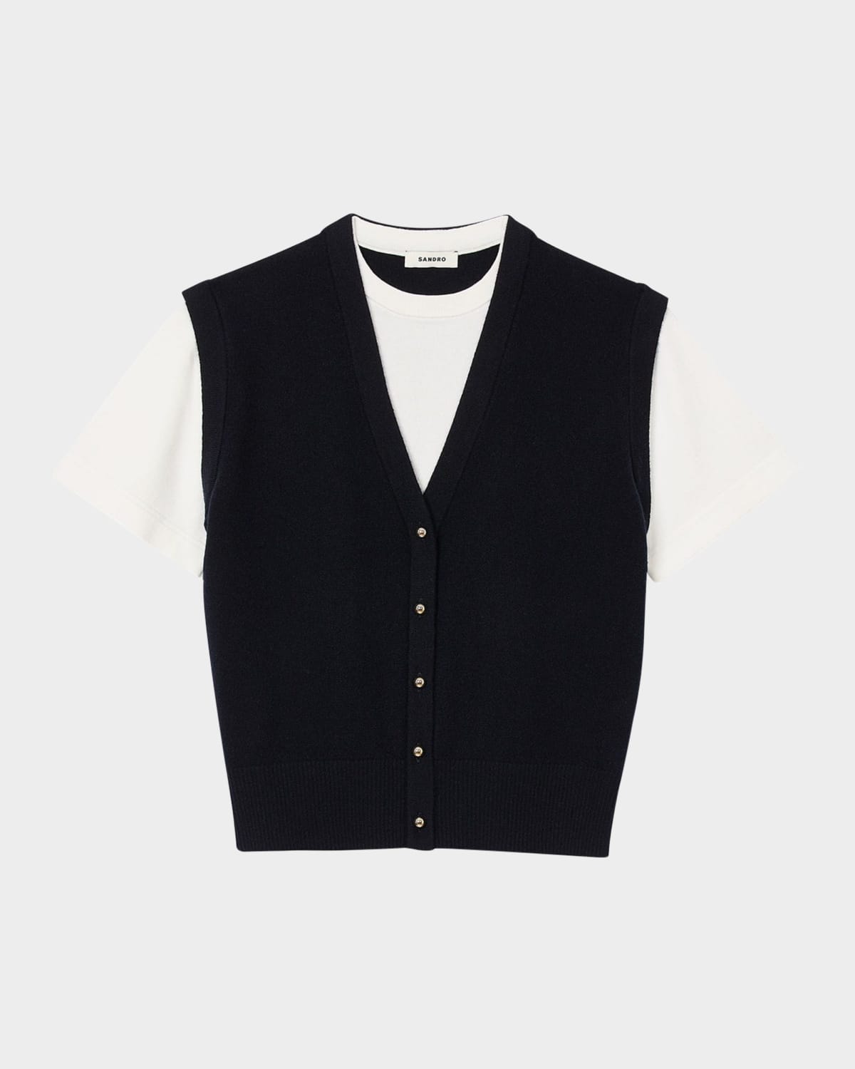 Sandro "Jonas" mixedmedia top features a vneck sweater vest atop a crewneck tshirt Crew neckline Short sleeves Hip length Relaxed fit Pullover style Wool/cashmere/cotton/viscose/polyamide Hand wash Imported