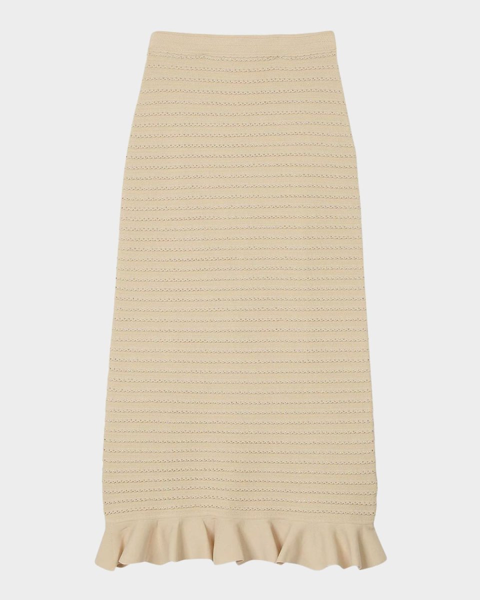 Sandro "Merveilleuse" skirt with rhinestoneembellished scalloped detailing High rise Centercut back vent Ruffled hem falls below the knee Pencil style Slipon style Viscose/nylon/polyamide/elastane Hand wash Imported