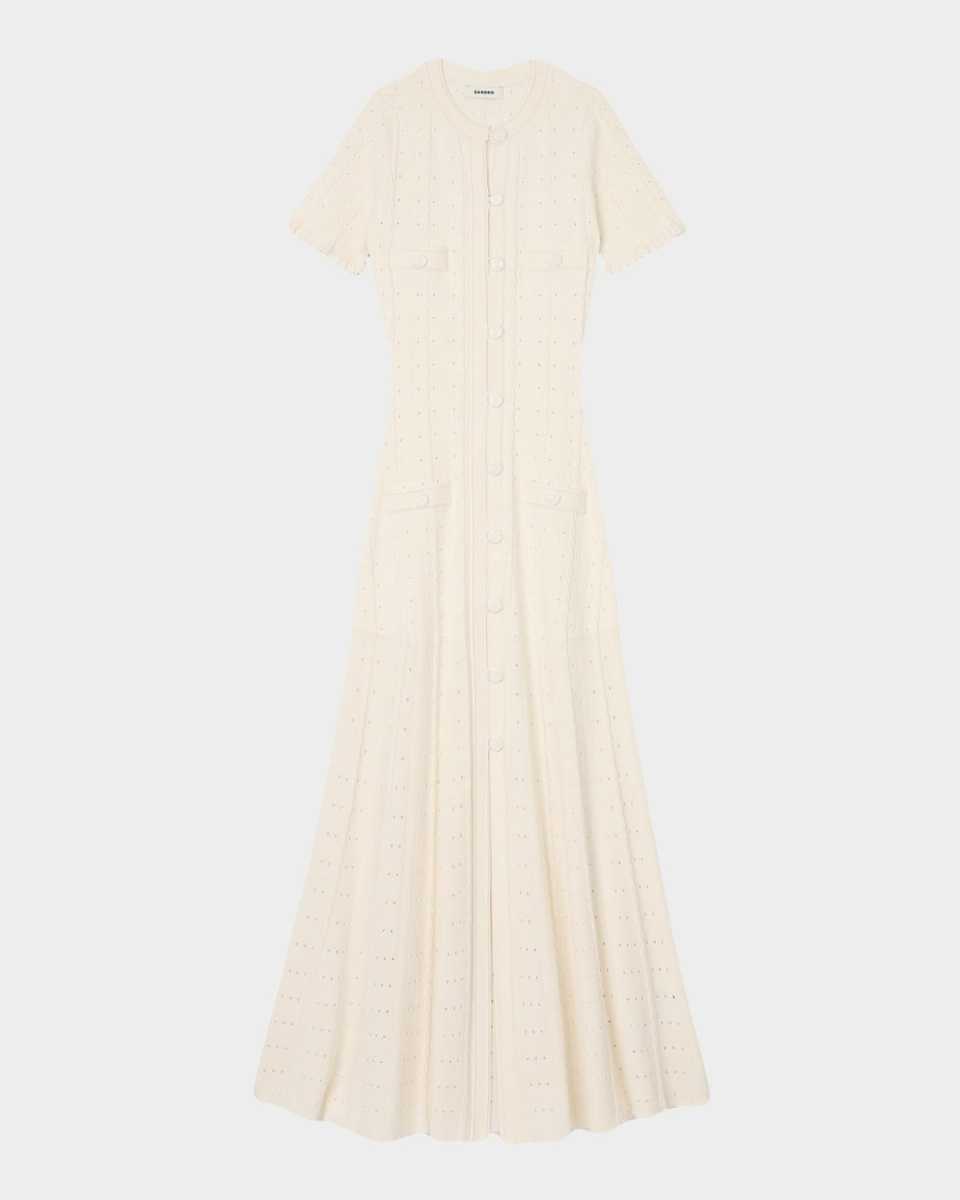 Sandro "Milo" knit dress finished with decorative stitching Round neckline; button fastening Short ruffled sleeves Welt mock pockets with press studs Hem falls below the knee Aline silhouette Viscose/nylon/polyamide/elastane Unlined Hand wash or dry clean Imported