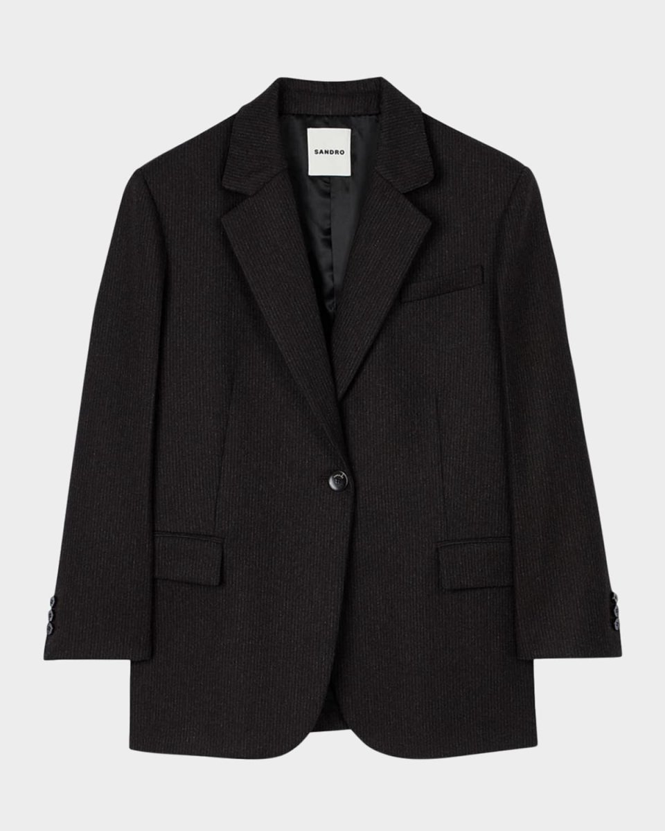 Sandro "Petra" pinstriped suit jacket Notched collar; singlebutton front Strong padded shoulders Long sleeves; button cuffs Chest welt pocket Hip flap pockets Vented back Oversized fit Wool/polyester/nylon/polyamide Lining: Viscose Dry clean Made in Bulgaria