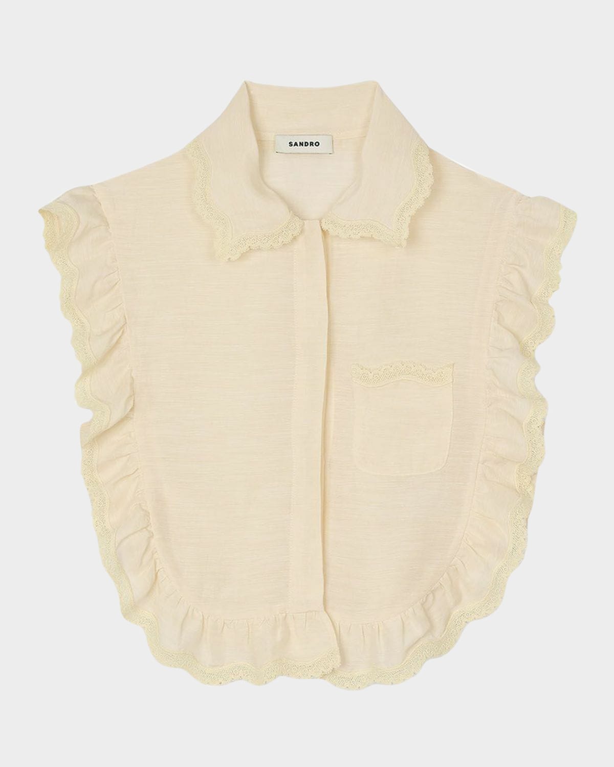 Sandro "Sicile" shirt adorned with flirty ruffles trimmed in feminine lace Collared neckline Sleeveless Chest patch pocket Relaxed fit Cropped hem Concealed button front closure Linen/viscose Machine wash cold Imported