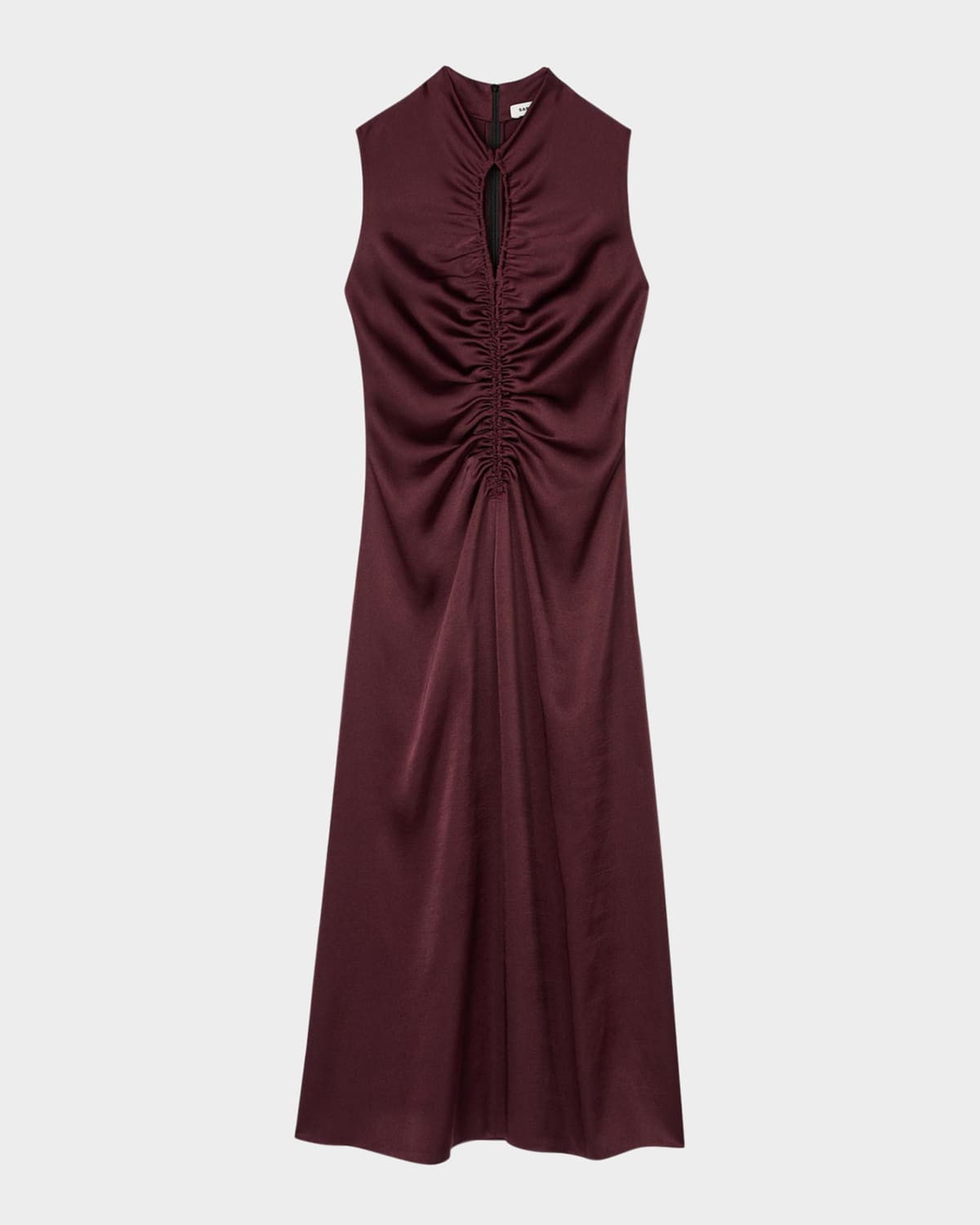 Sandro "Titanic" satineffect dress with front ruching Curved teardrop neckline Sleeveless Hem falls below the knee Flared skirt Invisible back zipper Polyester Unlined Dry clean Imported