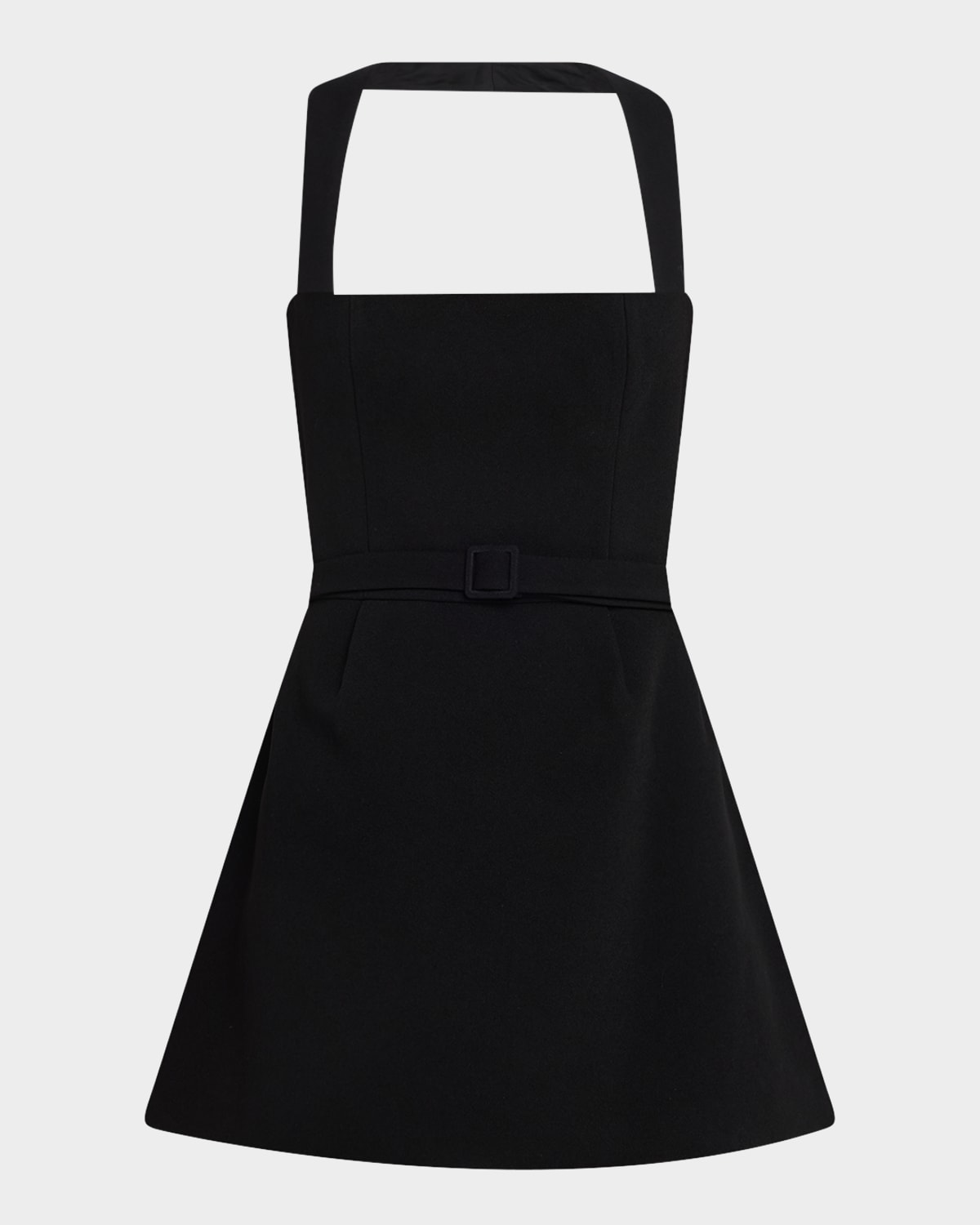 Elevate your favorite LBD with this mini halter dress finished with a bubble hem by Sans Faff. Square neckline with halter straps Sleeveless Belted waist Structured, Aline silhouette Hem falls above the knee Center back zip Acetate/polyester Lining: Viscose Dry clean Imported