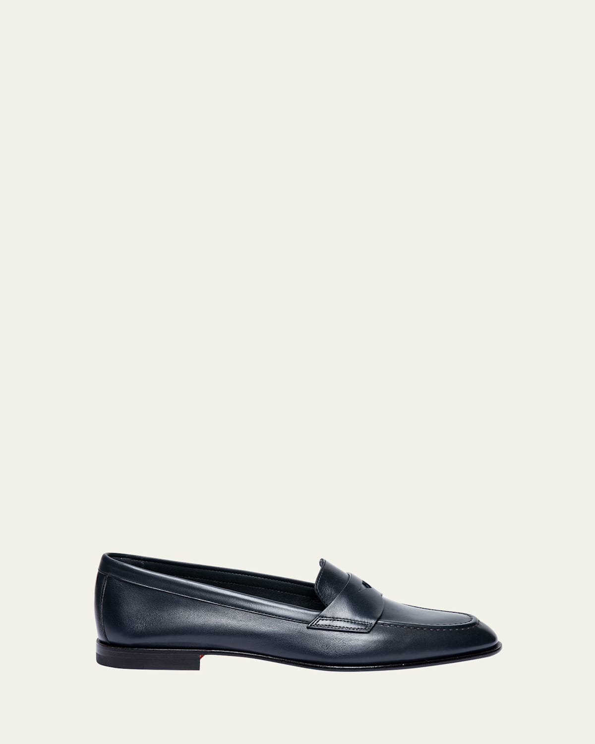 Santoni "Famed" classic smooth calf leather loafers Flat heel Round moc toe Notched vamp with keeper strap Slipon style Leather lining Leather outsole Made in Italy