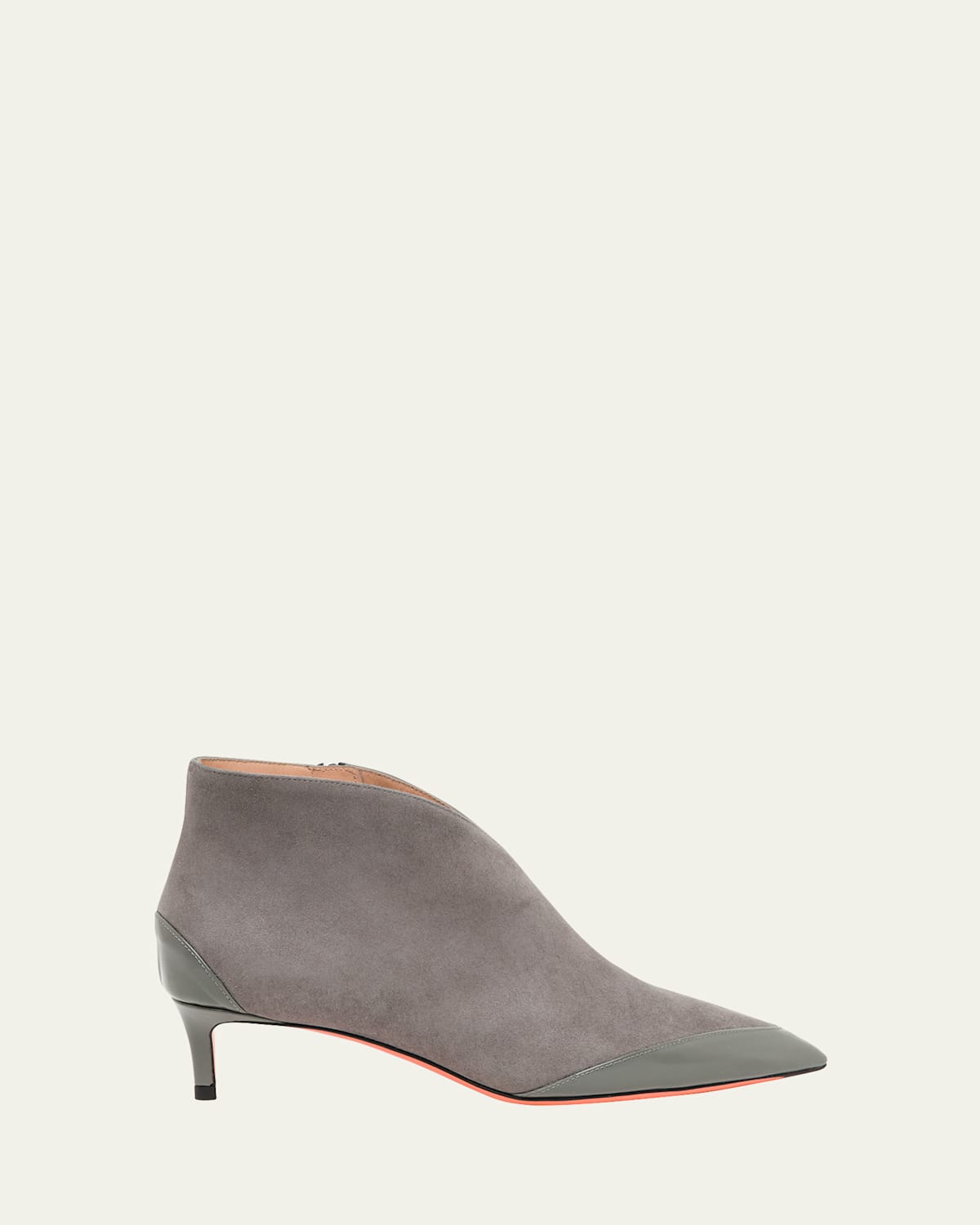 Santoni booties in tonal suede and patent leather 1.50 in / 40mm stiletto heel Pointed top Side zip eases dress Leather lining Leather outsole Made in Italy