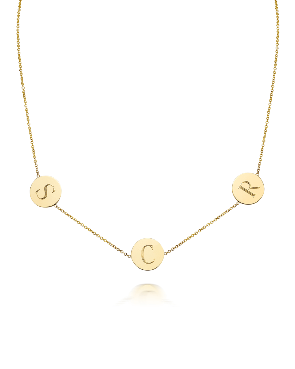 Sarah Chloe threedisc necklace. 14karat yellow gold hardware. Three 10mm engraved round discs. Each disc engraved with an uppercase block initial. Approx. 1618"L; 1"W spaces. Adjustable; spring ring clasp. Made in USA.