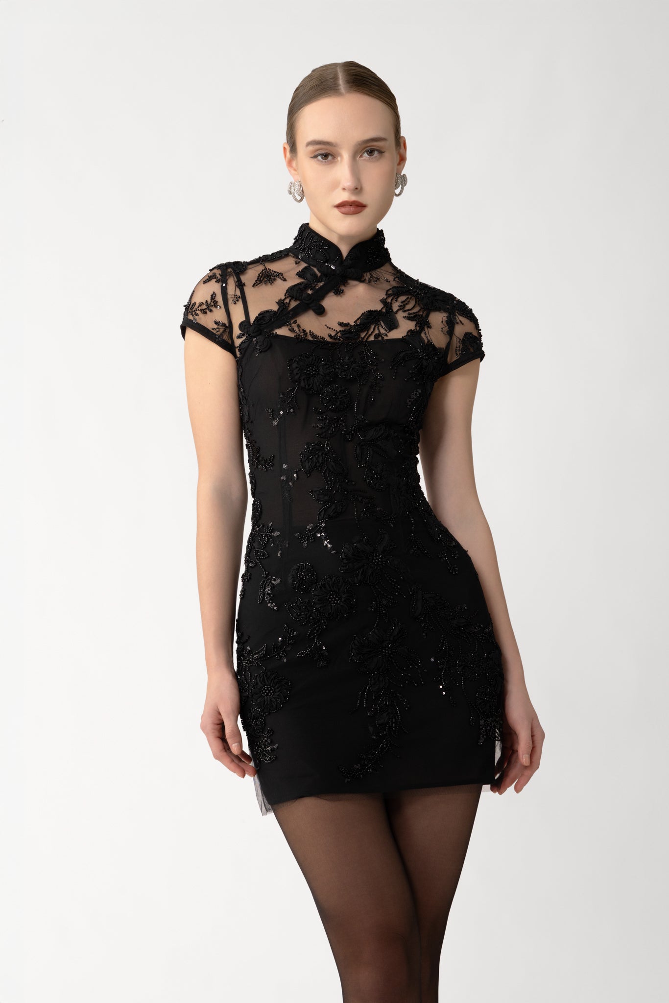 The Charlie Dress is a sheer, mini modern cheongsam adorned with intricate floral embroidery and beading. A bold statement piece for any party, it comes with an optional slip dress for added coverage.