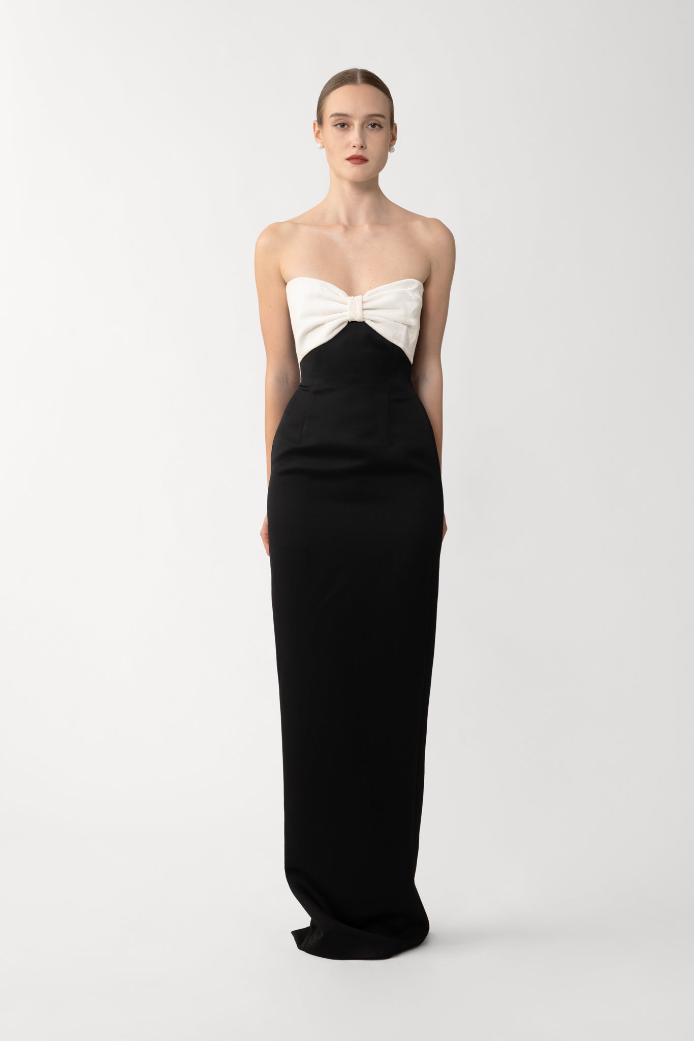 The Jaclyn Gown is a fitted column silhouette crafted in satin, featuring a contrast-color velvet bow-shaped bust that is perfect for evening occasions.
