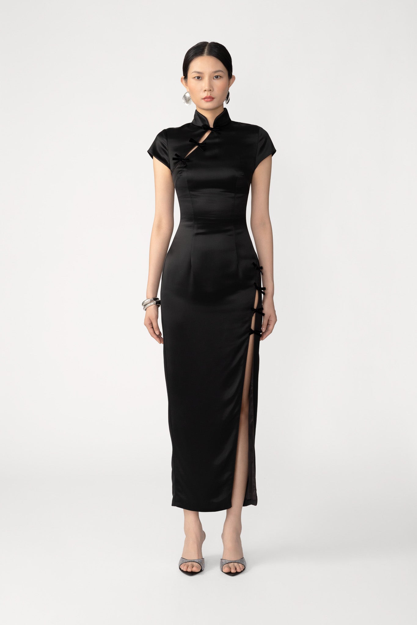 The Tamara Dress is a satin modern cheongsam with a mandarin collar, capped shoulders, and an asymmetrical slit at the collar and up the opposite thigh featuring mini velvet bows for a playfully festive touch.