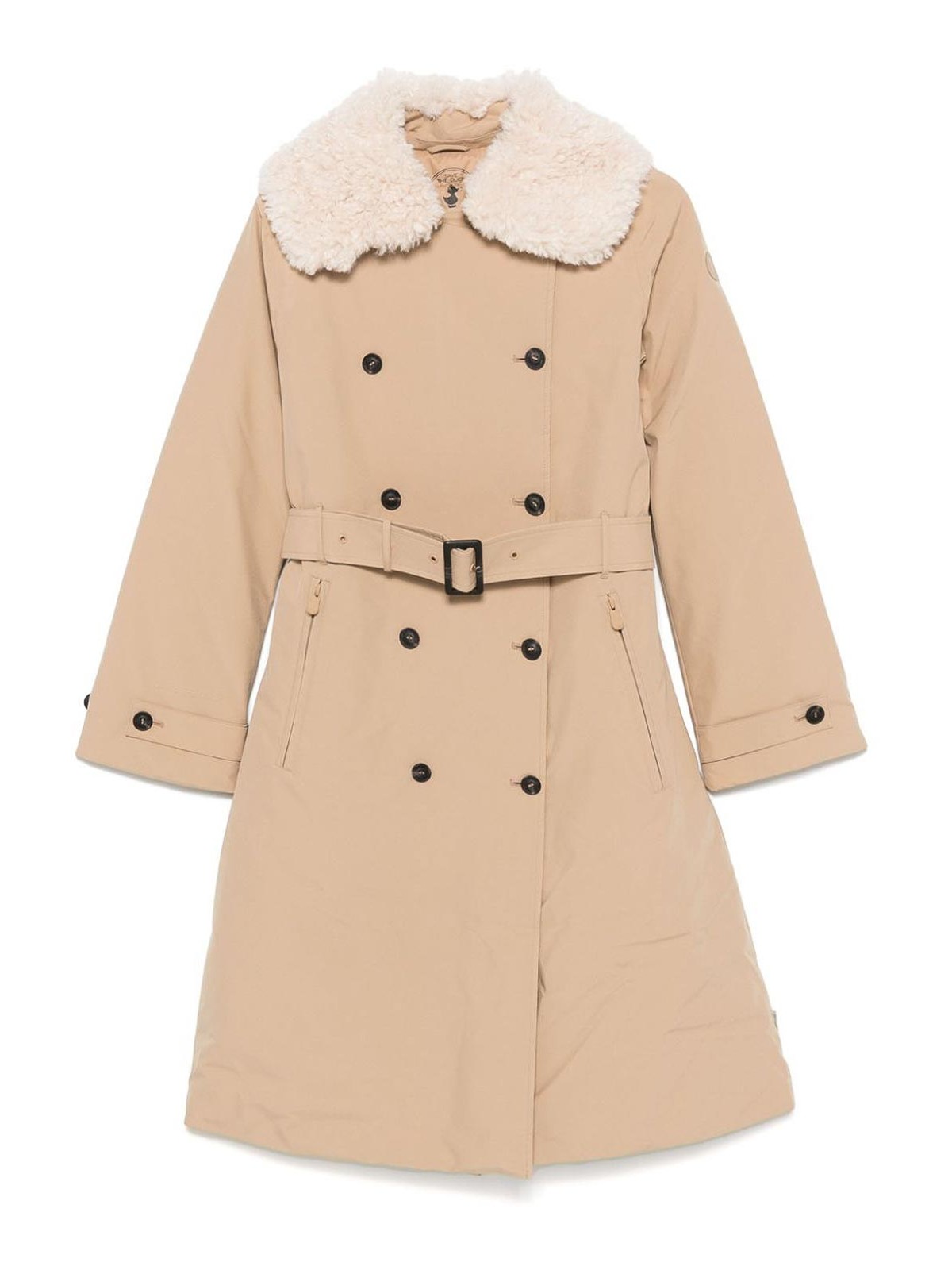 Design rembourré plumtech emblématique beige sable, fermeture éclair dissimulée, col boutonné à double boutonnage, col amovible, manches longues, écusson logo sur les poignets boutonnés, ceinture amovible et ajustable, fermeture éclair sur deux côtés, poches, ourlet droit matelassé
