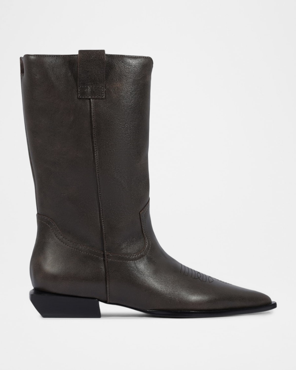 Schutz's "Ashley" leather midcalf boots bring icon behavior from the ground up with a streetmeetssaddle vibe that hits just right. The pointed toe and sculpted low heel add a directional edge. whether you're stomping through city streets or countryside detours, they've got your back. 1.25 in / 30 mm block heel Boot shaft, approx. 10"H Westerninspired stitching on the vamp Pointed toe Side pull tabs Pullon style Leather upper and outsole Lining: Synthetic Spot clean Made in Brazil