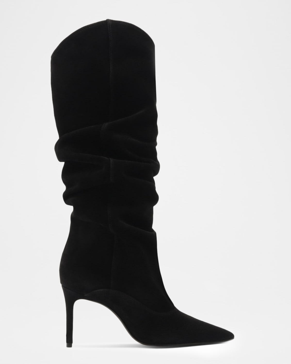 When classic meets sultry, these Schutz "Maryana Up Slouch" kneehigh boots in calf suede are all legs, all allure. The slouched shaft and sharp toe give it runway energy, while the sleek heel seals the deal. Pair with oversized denim or a bodycon midi for main character energy. These boots don't whisper-they shout. 3.25 in / 85 mm stiletto heel Pointed toe Curved collar Slouched shaft Slipon style Leather outsole Lining: Synthetic Spot clean Made in Brazil