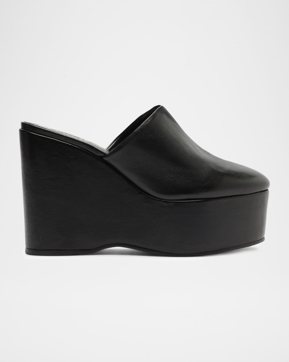 Schutz "Sierra" wedge mules in supple calfskin leather are where laidback meets elevated in the boldest way. Taking your outfits to new heights, this modern mule with a nostalgic soul is perfect for night outs or day flexes. Wear it with socks and cargo, or take it clean with an allblack fit. 4.50 in / 115 mm platform wedge heel Almond toe Slipon style Selfcovered midsole Lining: Synthetic Spot clean Made in Brazil