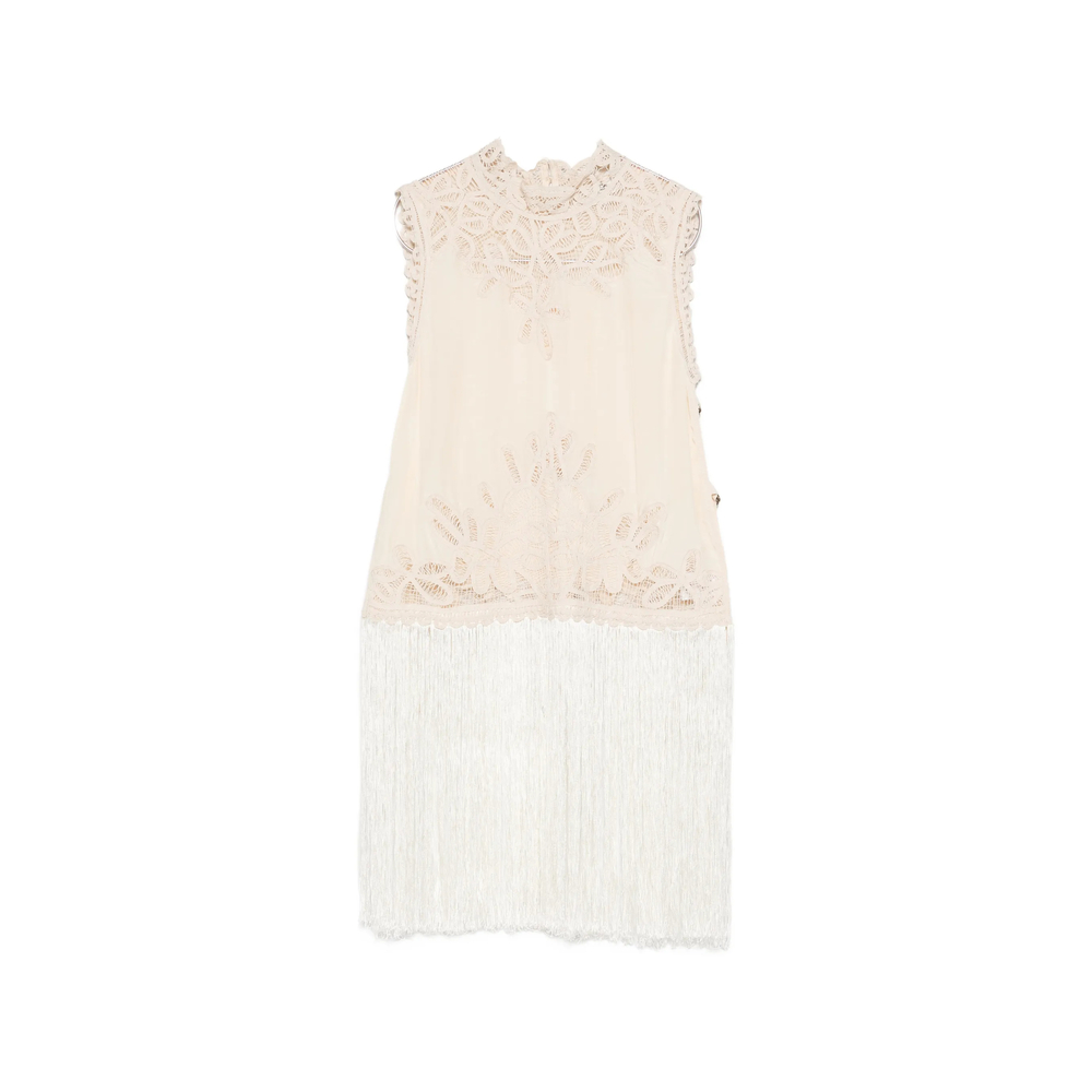beige lace detail fringed hem sleeveless round neck sheer panel