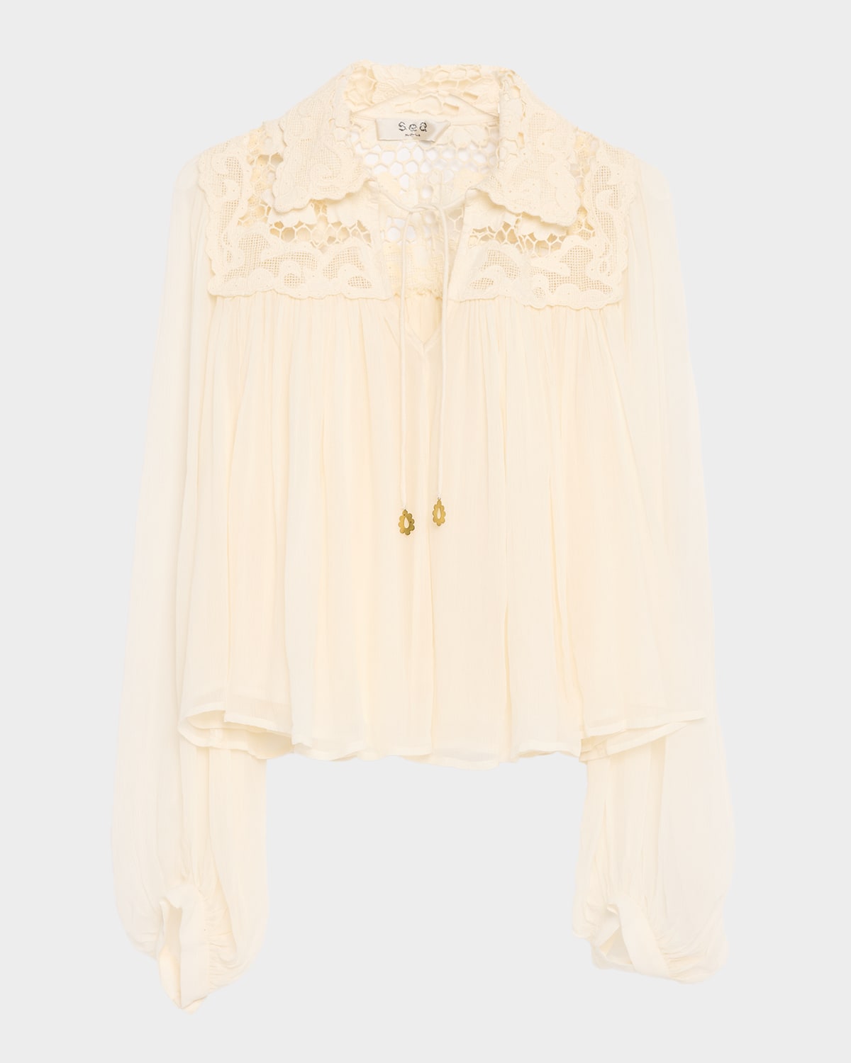 Sea "Daphne" cottongauze top finished with a lace embroidered collar and yoke Selftie V neckline Long sleeves; approx. 25"L Classic fit Hem falls to the hip Pullover style Cotton/viscose/polyester Dry clean Imported