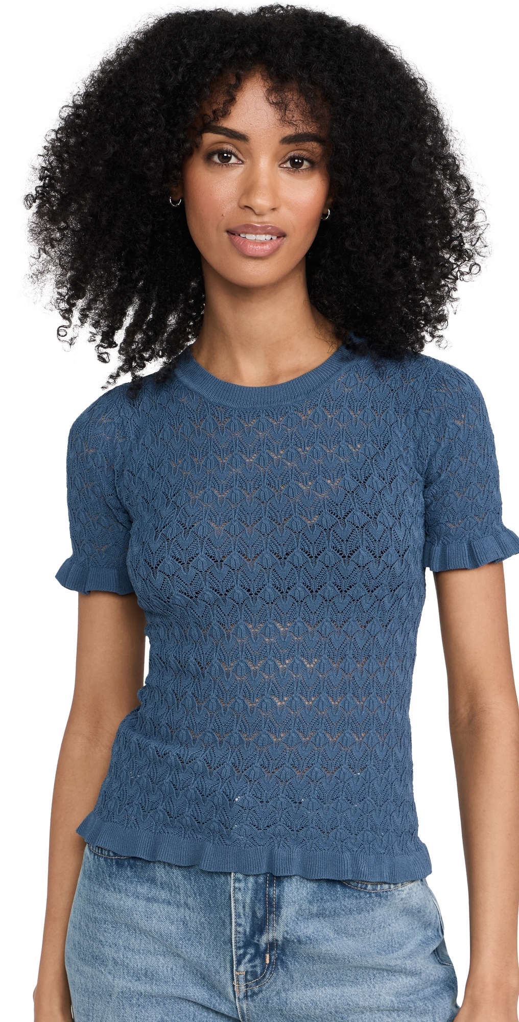 Fabric: Lightweight, pointelle knit. Ruffle cuffs and hem. Round neckline and short sleeves. Shell: 83% viscose/17% polyester. Dry clean. Imported, China. Measurements: Measurements from size XS Length: 19.25in / 49.0cm, from shoulder