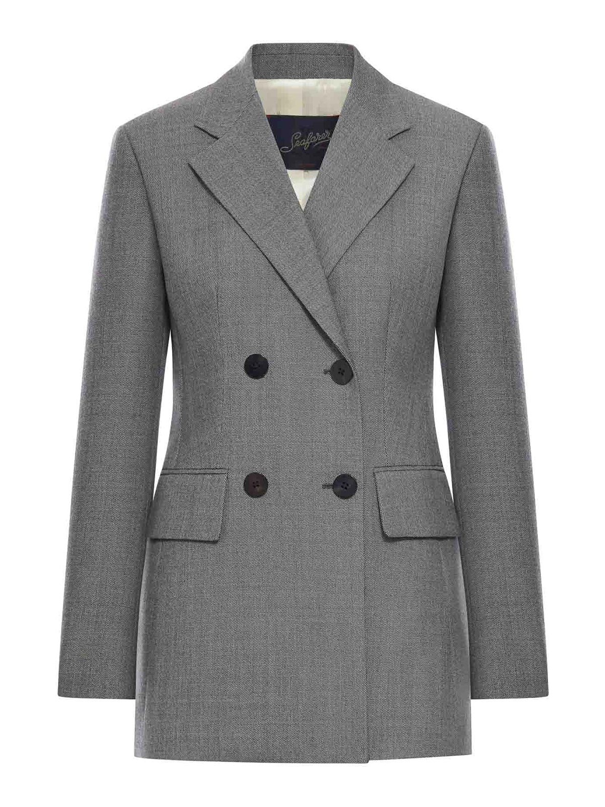 Veste boutonnée à double boutonnage, épaules larges, taille ajustée, revers crantés, manches longues, deux poches passepoilées à rabats, patte de boutonnage, gris