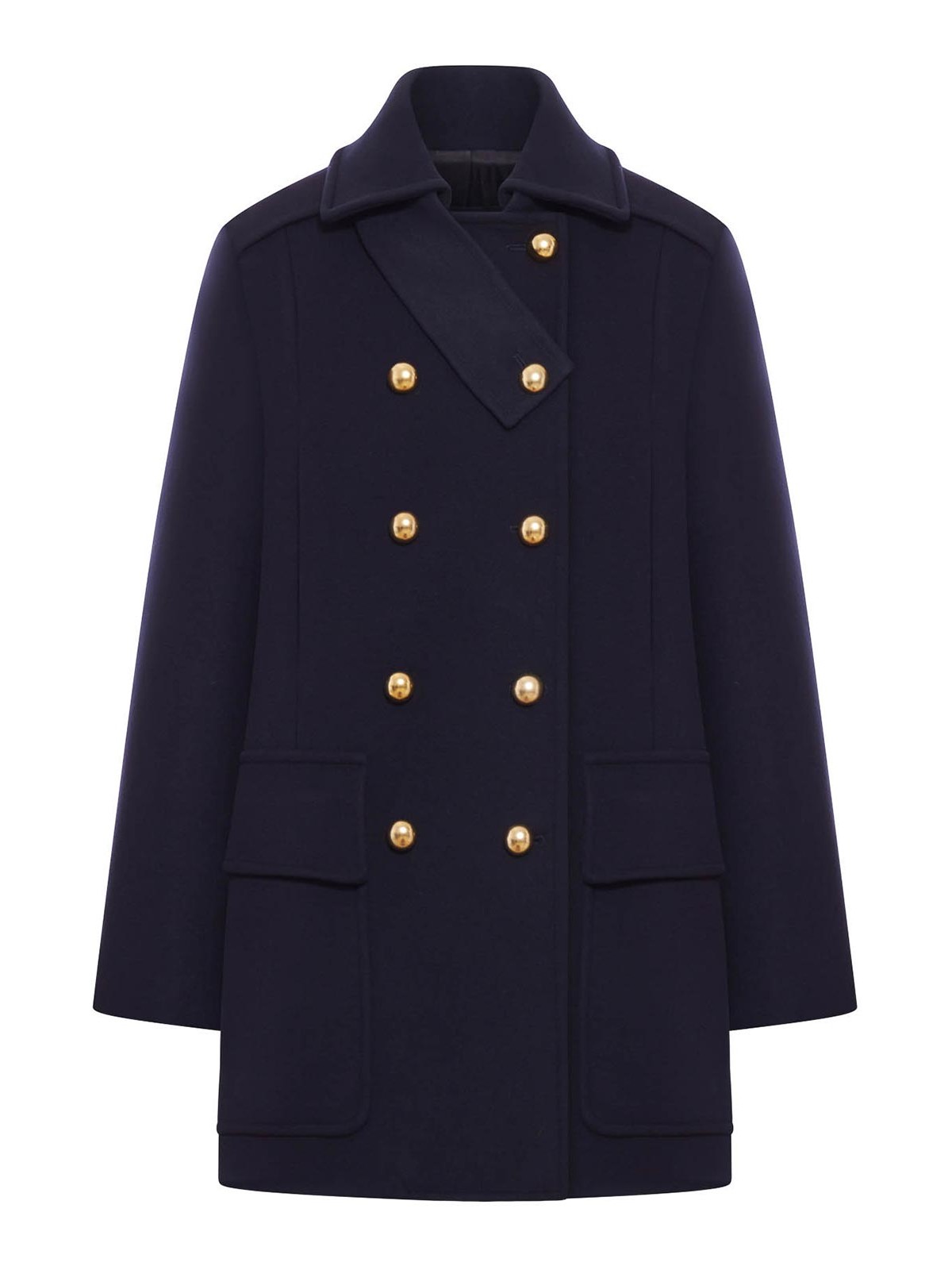 Col classique, double boutonnage boutonné, deux poches plaquées à rabats, manches longues, ourlet droit, bande arrière à quatre boutons et tissu mélangé, bleu marine