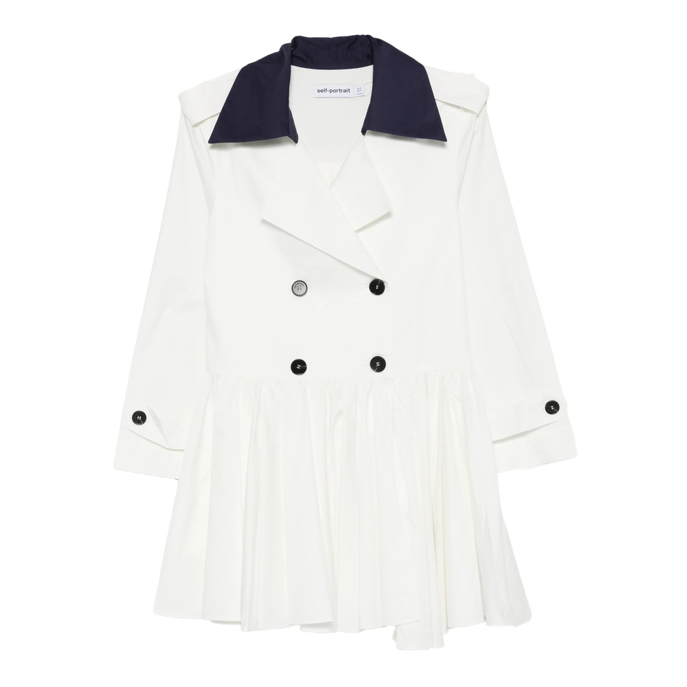 white cotton contrast collar double-breasted button fastening long sleeves pleated skirt