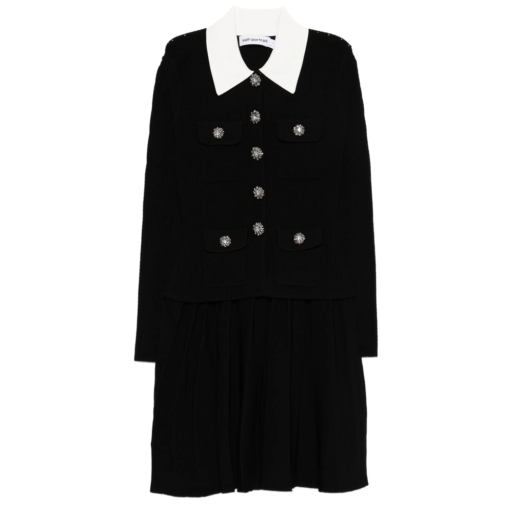 black white collar embellished buttons pleated skirt front pockets long sleeves