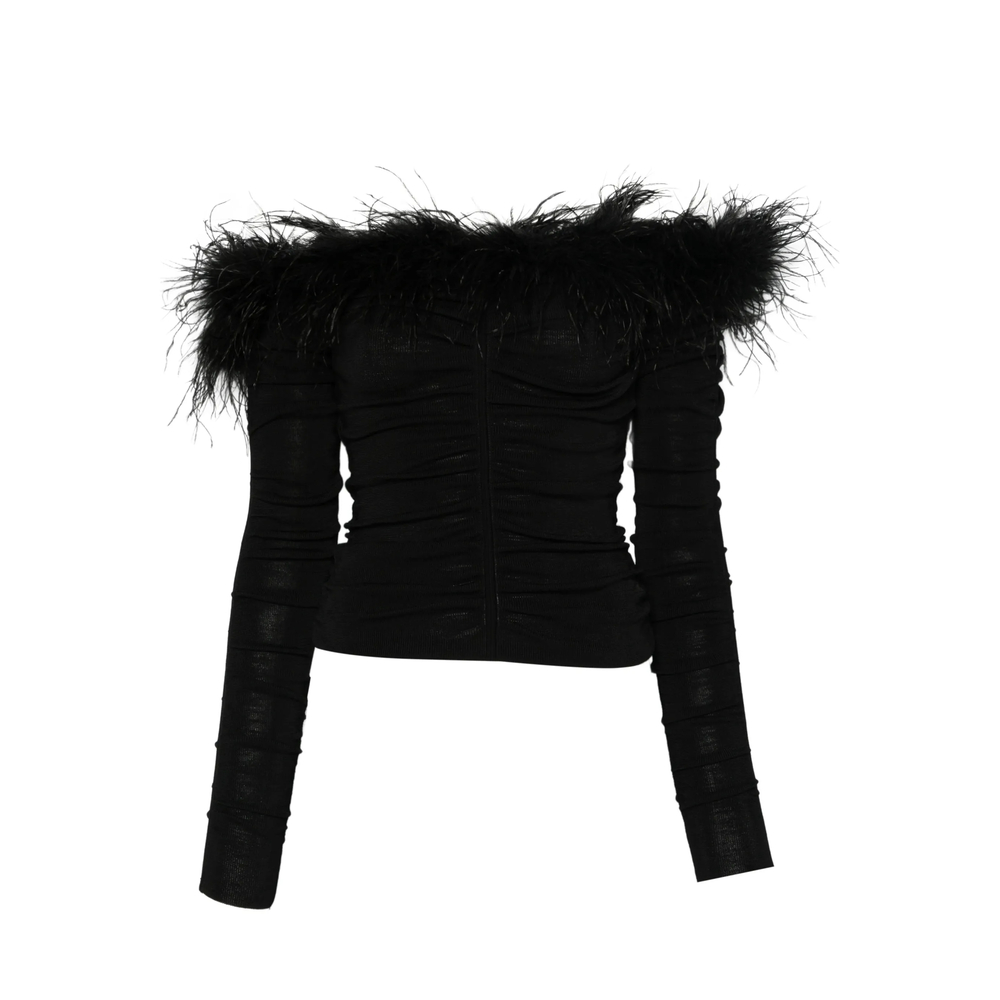black feather trim long sleeves ruched detail off-shoulder zip fastening