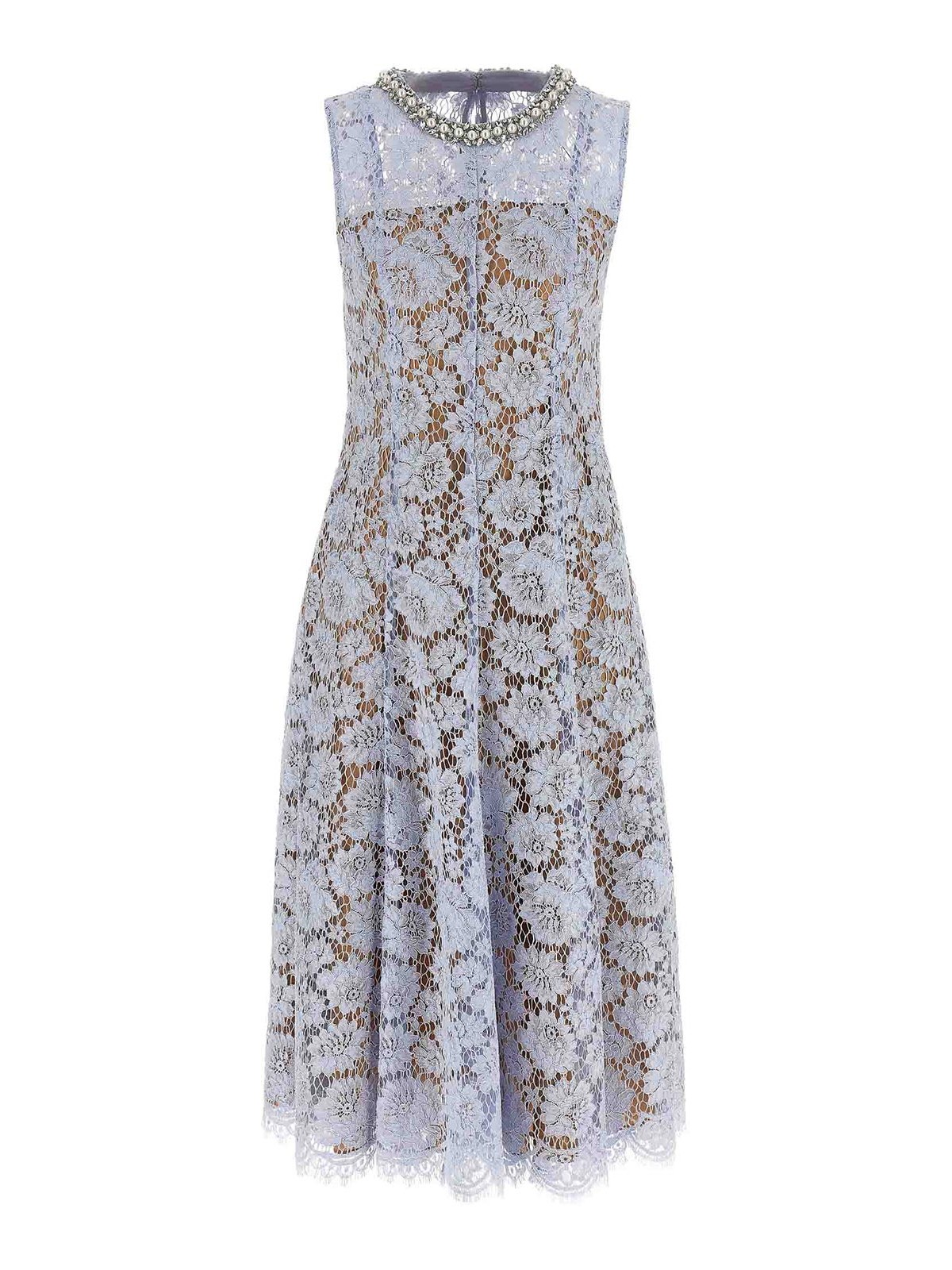 robe midi en dentelle fine bleue à col rond avec décoration, jupe évasée, fermeture éclair sans manches et crochet dorsal avec découpe en forme de larme