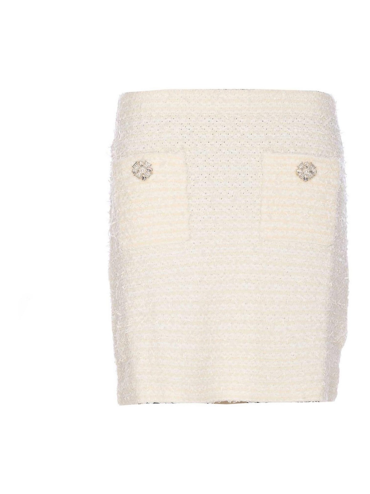 Autoportrait, jupe « boucle crème », toutes poches, application sur le nom du créateur. Couleur: blanc.