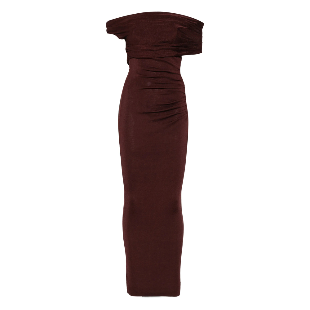 brown off-shoulder style ruched detailing fitted design below-the-knee length