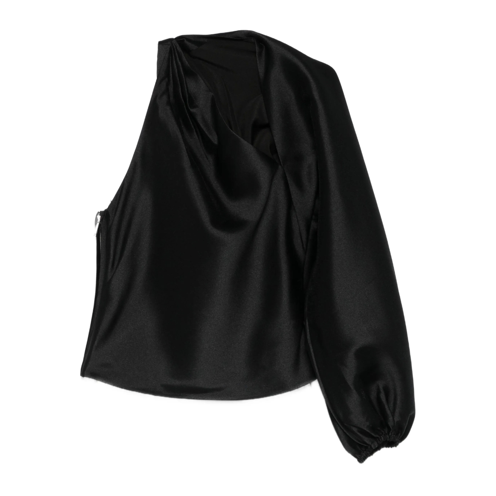 black one shoulder asymmetric sleeve draped detailing zip fastening