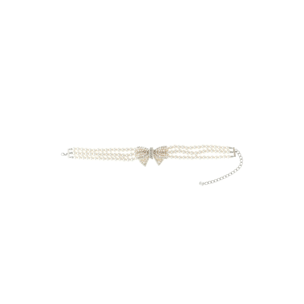 white pearls crystals embellished bow detail three-strand lobster clasp