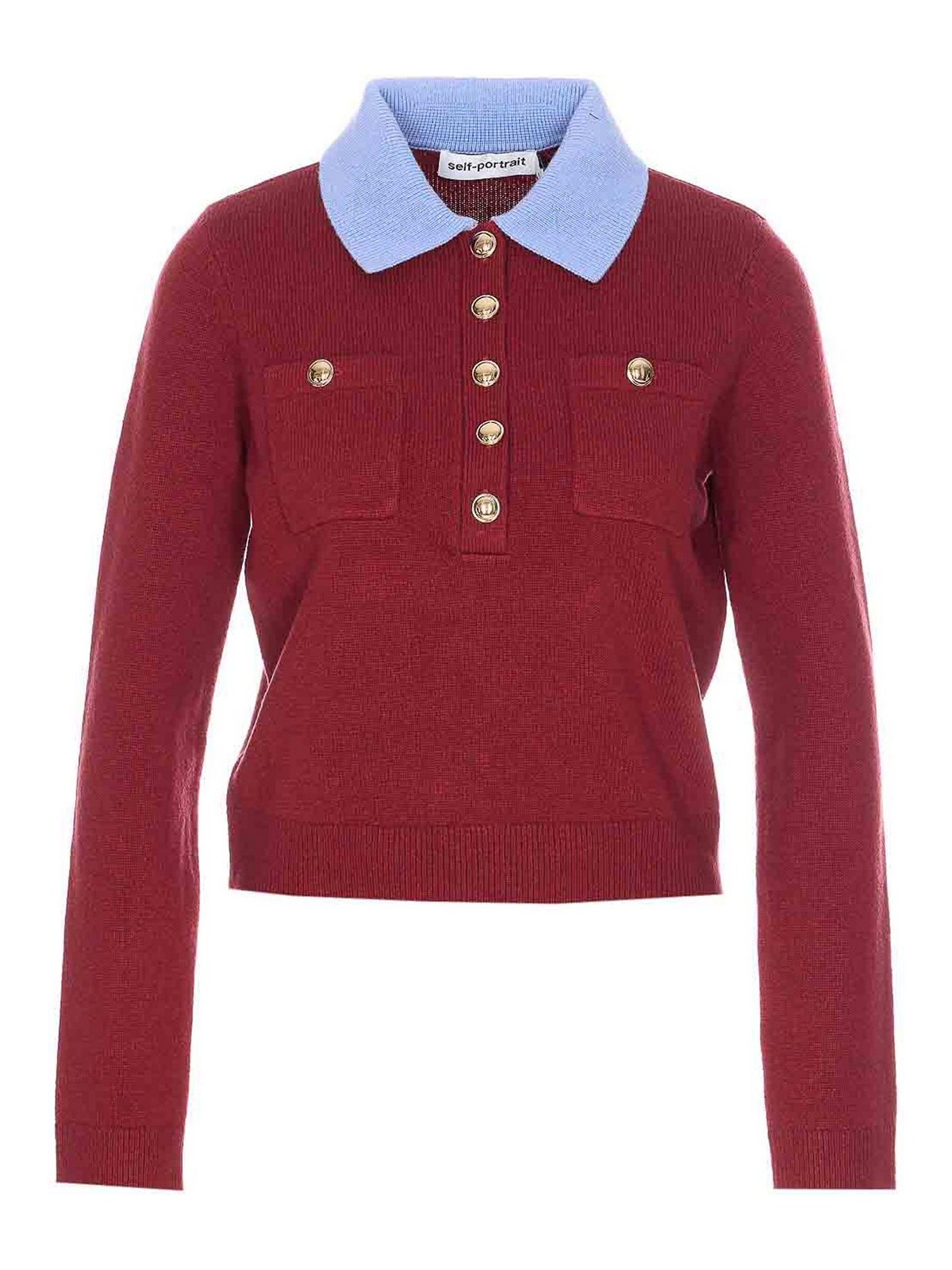 Pull bordeaux autoportrait, boutons dorés, manches longues, col classique, poche frontale, couleur du créateur: rouge
