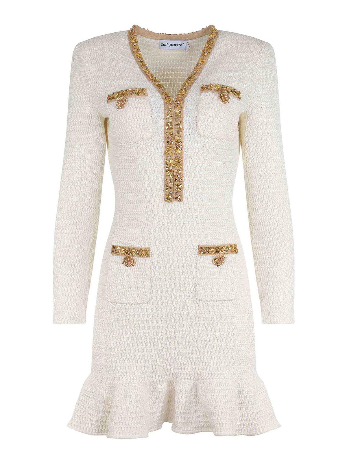 Robe autoportrait, manches, bretelles amovibles avec boutons, col en V, col avec crochets à l'encolure, quatre poches avec boutons contrastants sur l'encolure et poches, fleurs appliquées sur les poches