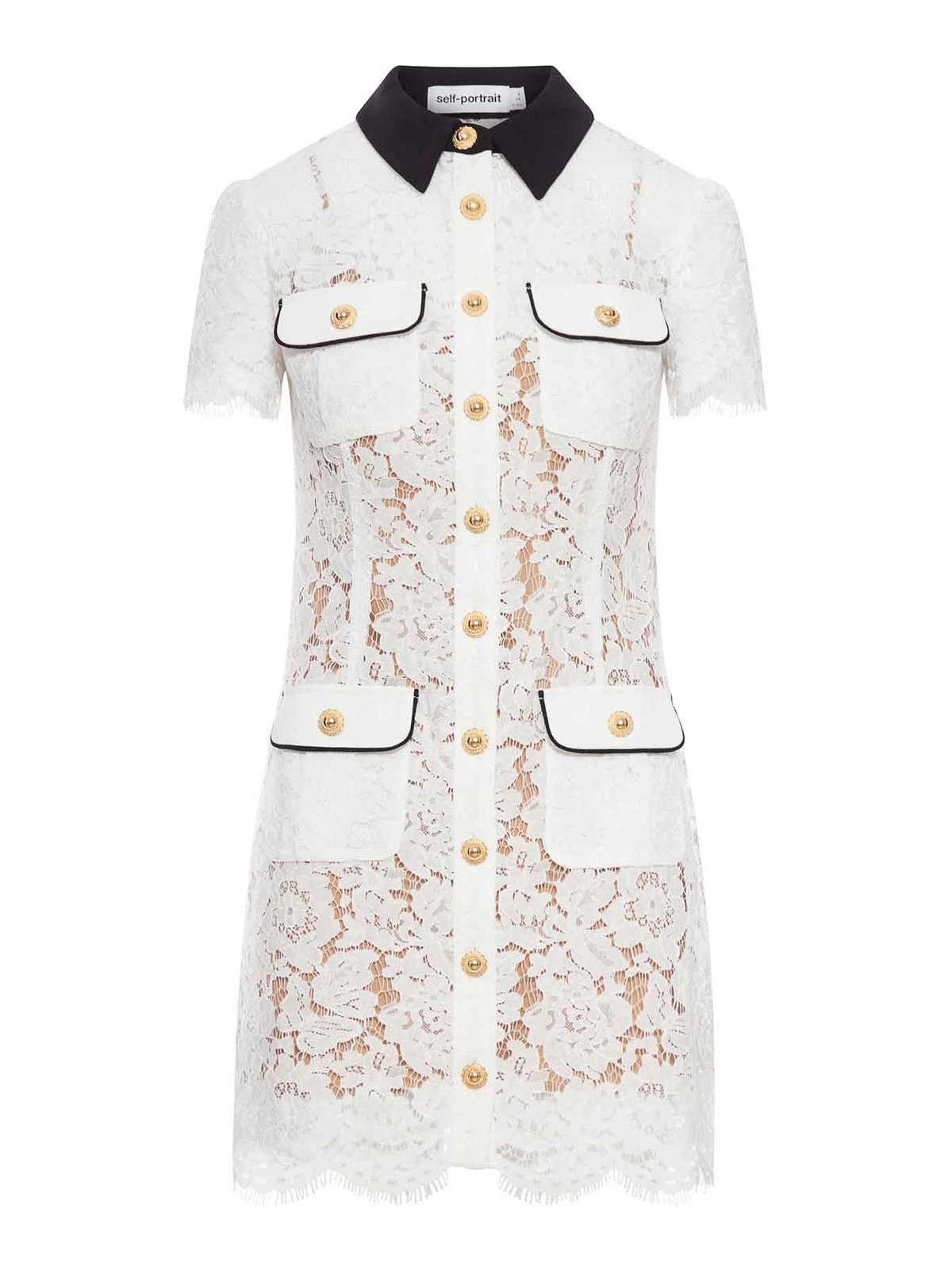 Col classique contrastant- boutons en bijou- poches- pinces- manches courtes- coupe cintrée- couleur blanc