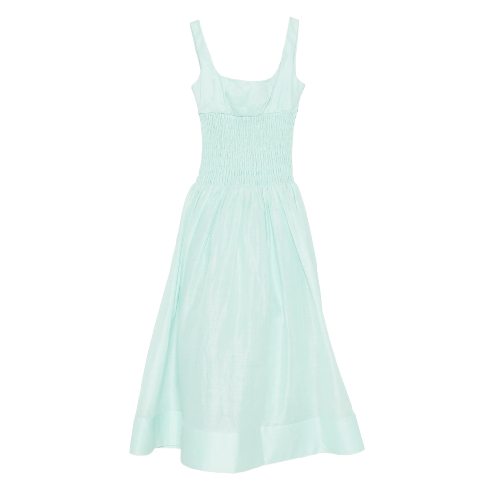 mint green square neck shirred panel sleeveless flared skirt mid-length