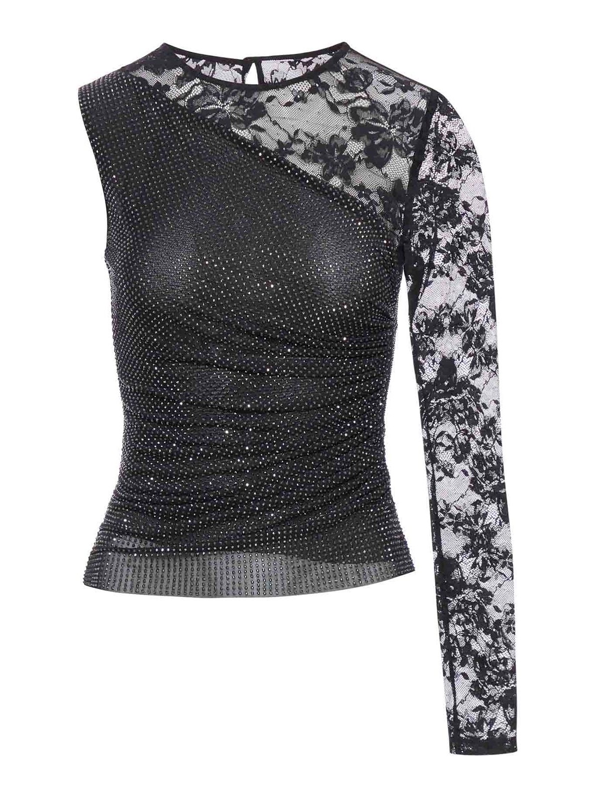 Col rond, boutons, manches longues en dentelle, taille drapée, coupe ajustée, couleur noire