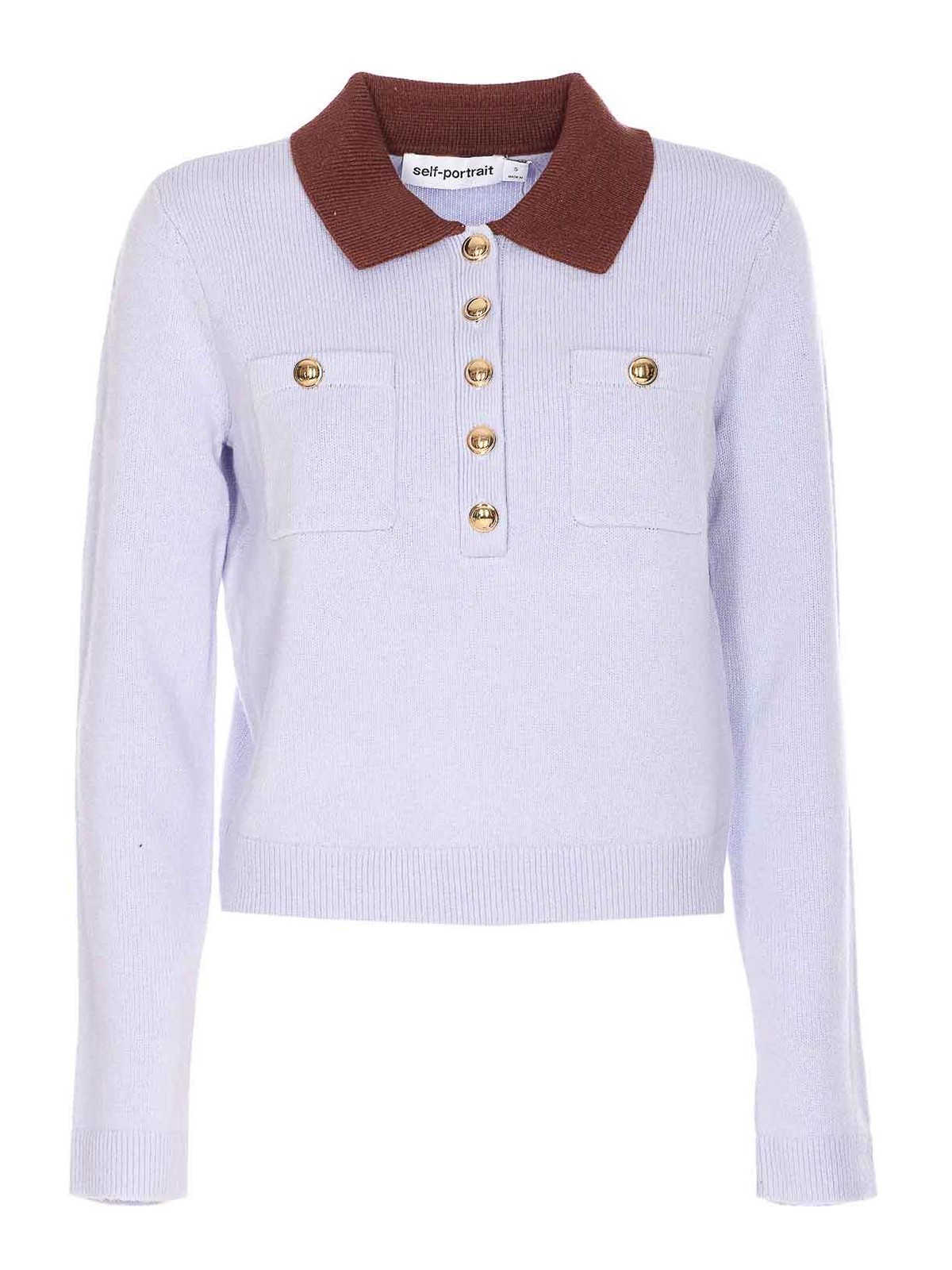 Autoportrait bleu clair, col tricoté, boutons supérieurs en tricot sur le