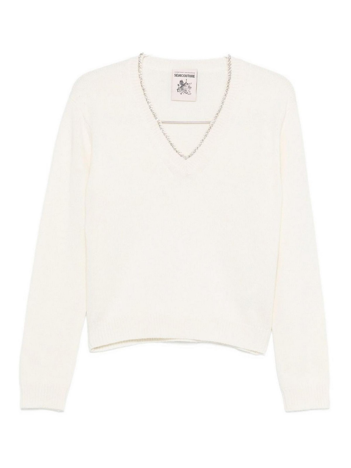 V blanc, ornement du col, manches longues, ourlet côtelé
