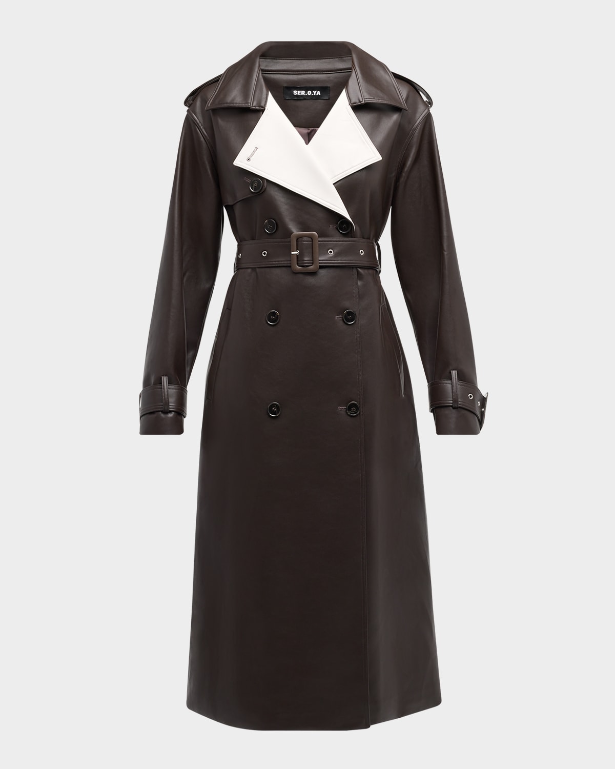 SER.O.YA "Estelle" vegan leather trench coat Notched collar; doublebreasted front Shoulder epaulettes Long sleeves; belted cuffs Belted waist Sideentry welt pockets Full length Straight silhouette Polyurethane/polyester Lining: Polyester Dry clean Imported