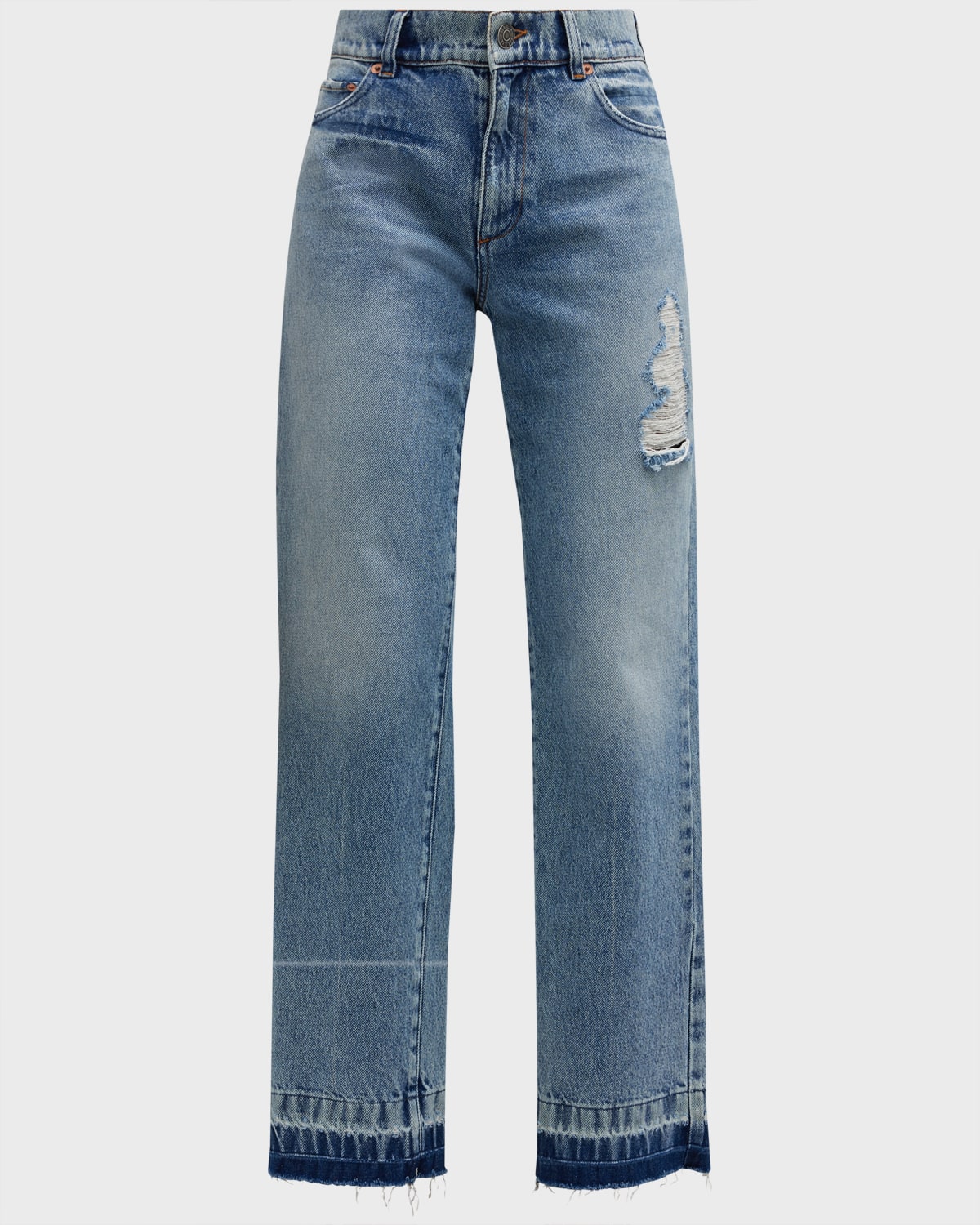 SER.O.YA "Maggie" distressed straightleg jeans featuring an elastic back waist and undone raw hem in a faded, medium wash denim Fivepocket style Midrise Waisthugging fit Ankle length Button/zip fly; belt loops Cotton/elastane Machine wash cold Made in Italy