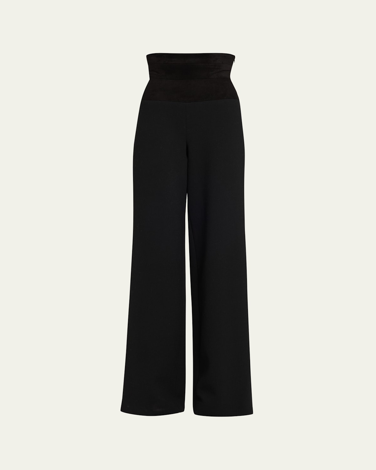 Sergio Hudson pants are tailored in a stretch wool crepe featuring a lambskin suede coresetlike cummerbund waist with ribbon laces in the back High rise Flat front Wide legs Full length Laceup back Wool/Lycra xfit® spandex/suede Lining: Silk/spandex Dry clean Made in USA