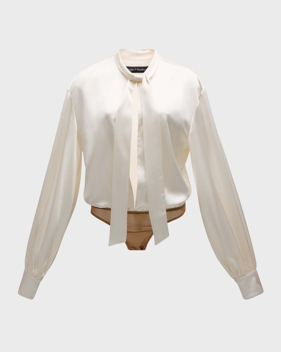Sergio Hudson silk charmeuse bodysuit fetauring a neck tie and a plunging front slit Round neckline; button/keyhole front Long blouson sleeves; button cuffs Relaxed fit Silk Made in USA