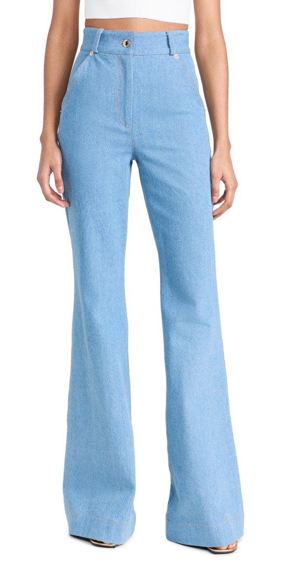 Fabric: Heavyweight, non-stretch denim. Full length. Button closure and zip fly. Slant hip pockets and faux welt back pockets. Shell: 100% cotton. Dry clean. Made in the USA. Measurements: Measurements from size 0 Rise: 15in / 38cm Inseam: 35.75in / 91cm Leg opening: 25.25in / 64cm
