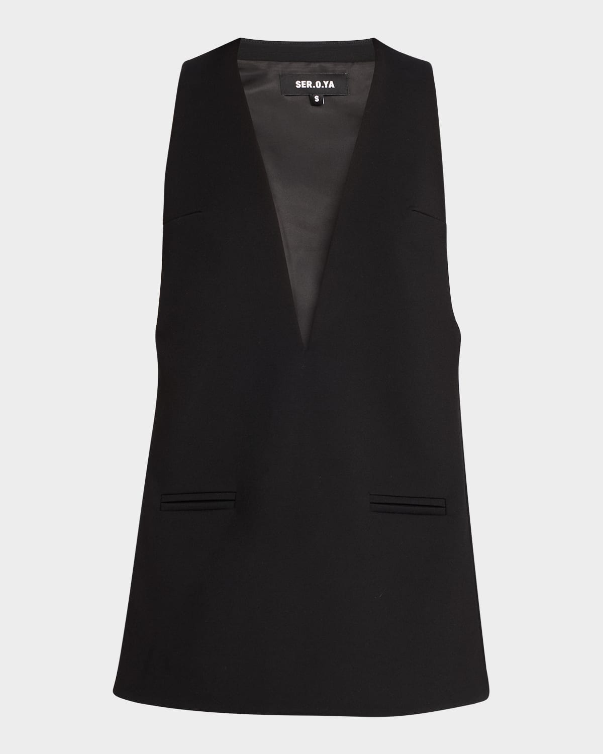 SEROYA "Hadley" dress in a tailored construction Deep V neckline Sleeveless Front welt pockets Hem falls above the knee Aline silhouette Slipover style Polyester/Promodal® rayon/nylon/polyamide Dry clean Imported