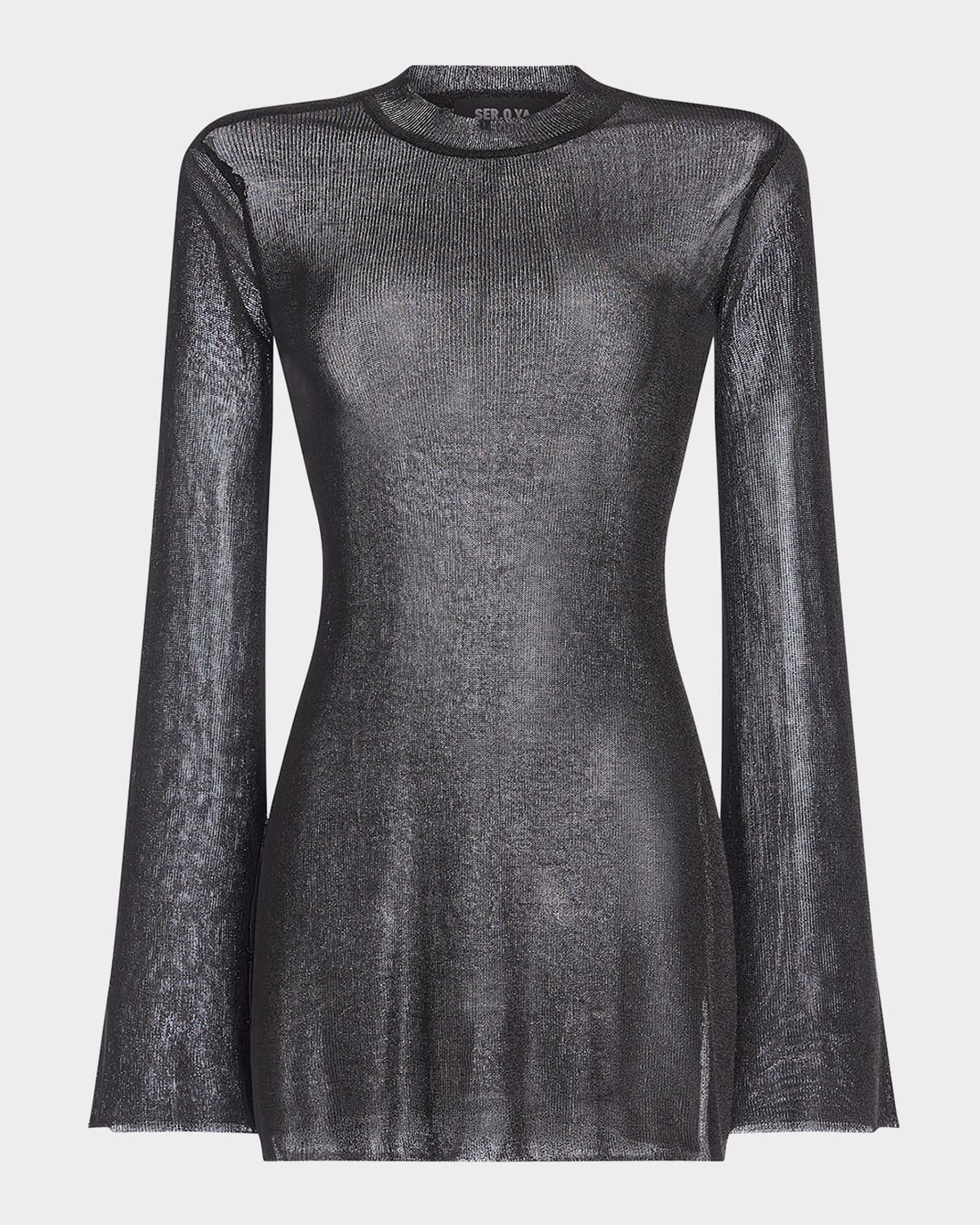 The "Ines" top by SEROYA is designed in a semisheer metallic knit fabrication and offers added coverage with its extralong length Crew neckline Long sleeves Slim fit Pullover style Viscose/metallic fibers Dry clean Imported