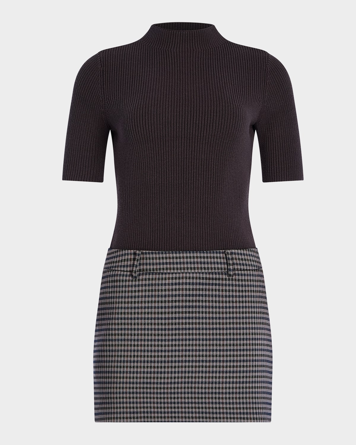 A combo silhouette, the "Jann" dress by SEROYA consists of a ribbed knit top and a houndstoothprinted skirt Mock neckline Short sleeves Side seam and back welt pockets Hem falls above the knee Slim fit Belt loops Polyester/spandex/viscose Dry clean Imported