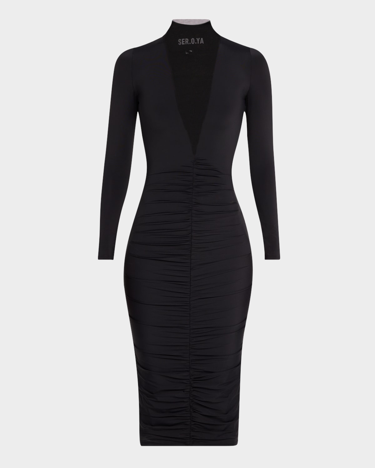 SEROYA "Priyanka" dress features a vcut mesh panel and a ruched center seam Mock neckline Long sleeves Hem falls below the knee Sheath silhouette Slipover style Polyester/spandex Imported
